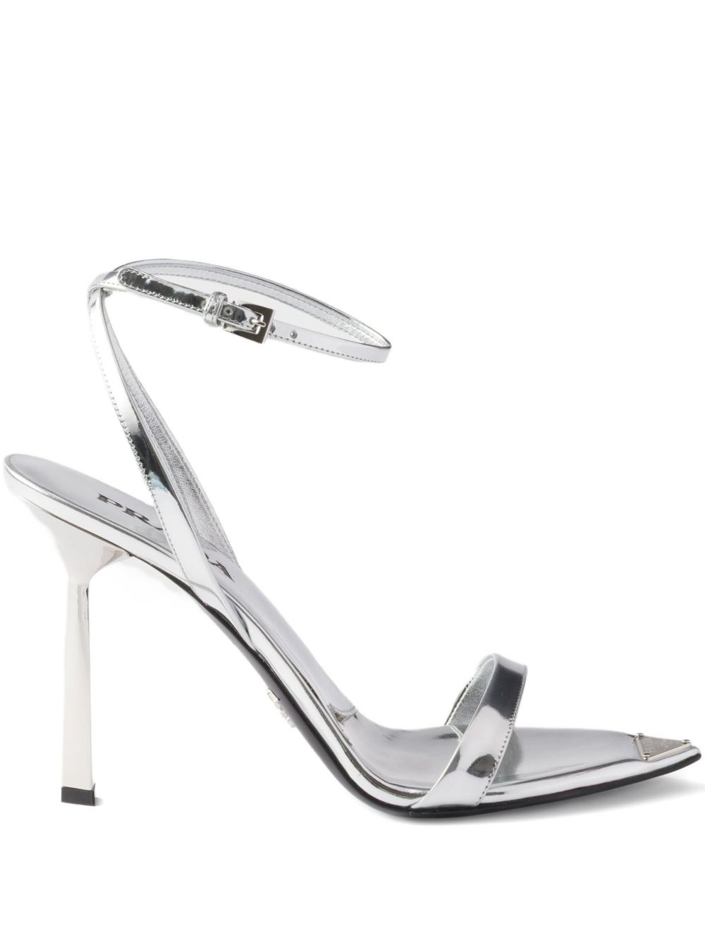80mm ankle-strap leather sandals Highlights - Silver-tone - Metallic leather - Ankle strap - Buckle fastening - Stiletto heel - Triangle logo Composition Outer: Leather 100% Sole: Leather 100% Lining: Leather 100% SIZE & FIT Measurement HEEL 3.14 in(8 cm)
