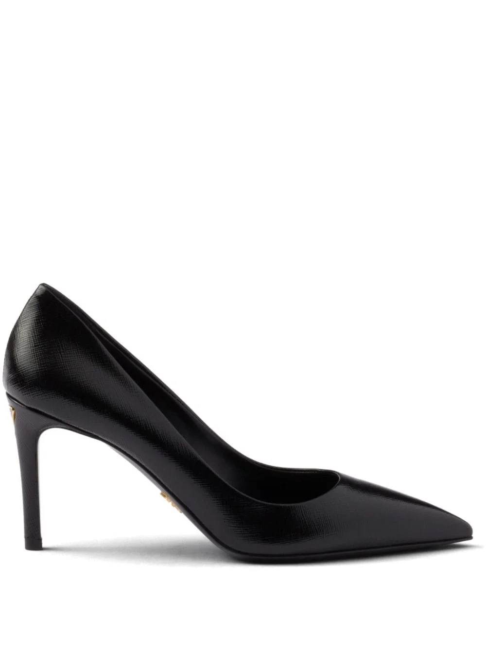 85mm Saffiano leather pumps Highlights - Black - Calf leather - Saffiano leather - Patent finish - Enamel triangle logo - 85mm high heel - Pointed toe - Slip-on style - Branded insole Composition Outer: Patent Calf Leather 100% Sole: Rubber 100%, Calf Leather 100% Lining: Calf Leather 100% SIZE & FIT Measurement HEEL 3.34 in(8.5 cm)