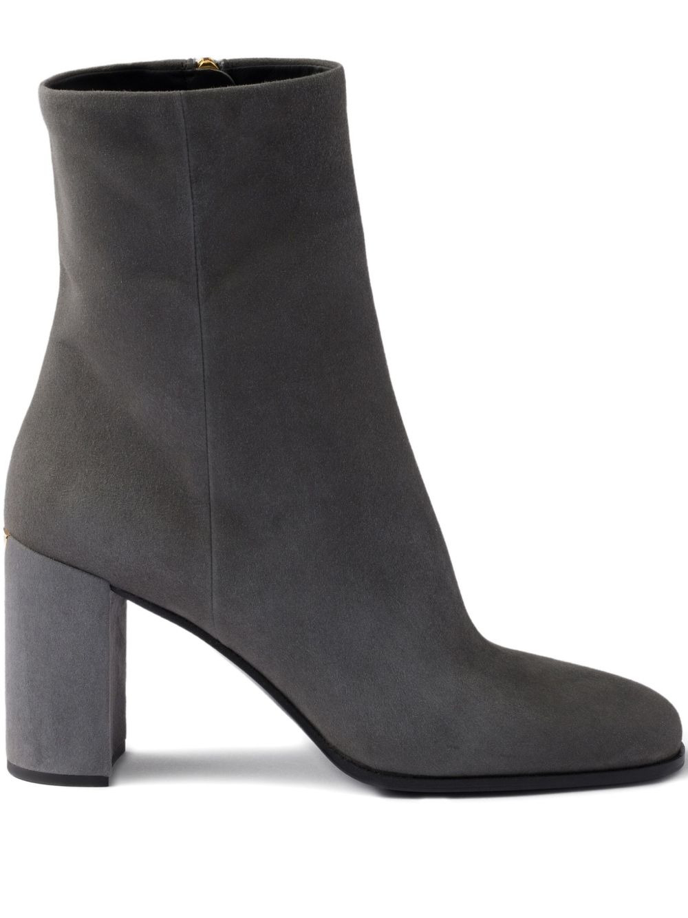 85mm suede block-heel boots Highlights - Grey - Suede - Block heel - Side zip fastening - Round toe - Triangle logo detail Composition Sole: Rubber 100% Outer: Calf Suede 100% Lining: Calf Leather 100% SIZE & FIT Measurement HEEL 3.34 in(8.5 cm)