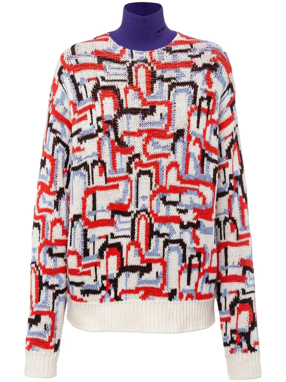 abstract-pattern knitted jumper Prada combines its distinguished aesthetic with unexpected styles. A fine example, this jumper features a snug-fitting turtleneck, whilst the vibrant intarsia pattern is a reference to the brand's prints of 1996. Highlights - Multicolour - Virgin wool-cashmere blend - High neck - Logo-embroidered collar - Long sleeves - Ribbed cuffs - Ribbed hem - Abstract pattern print - Intarsia knit Composition Virgin Wool 68%, Cashmere 29%, Cotton 3% Washing instructions Read Manufacturer Guidelines
