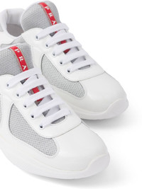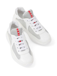 America's Cup sneakers Prada's America's Cup sneakers debuted in 1997 as part of the Linea Rossa technical collection. Staying true to the original, this new iteration still features the iconic red line across the tongue and the overall minimalist design, twisted with the lace-up fastening at the front. Highlights - White/medium grey - Leather - Colour-block panelled design - Signature linea rossa logo patch at the tongue and sole - Branded insole - Almond toe - Front lace-up fastening - Flat rubber sole Composition Leather 100%
