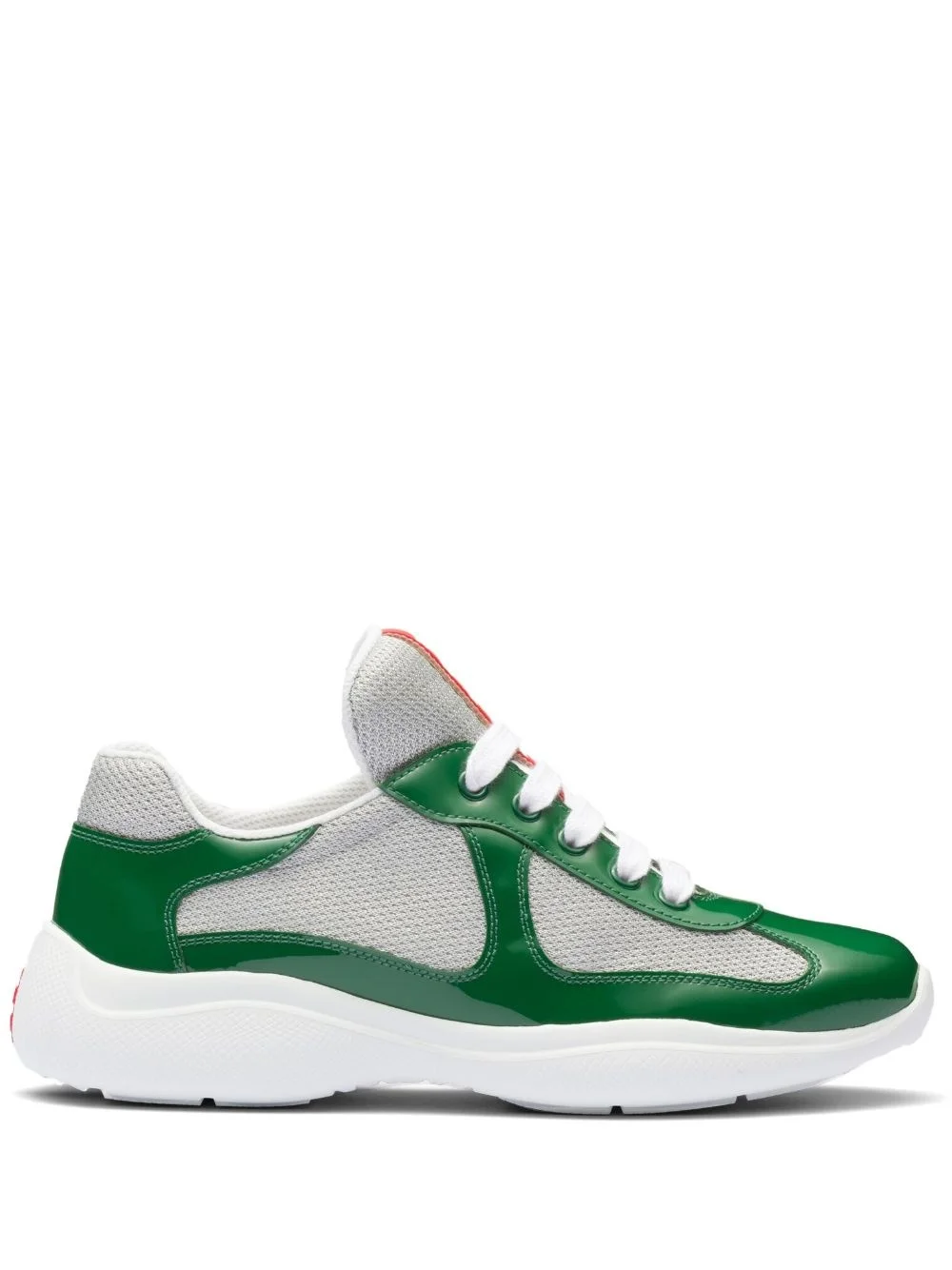 America's Cup panelled sneakers Prada's America's Cup sneakers debuted in 1997 as part of the Linea Rossa technical collection. Staying true to the original, this patent-leather and mesh iteration retains the iconic red line across the tongue and the overall minimalist design. Highlights - Green/grey - Leather - Patent finish - Mesh detailing - Logo patch at the tongue - Branded insole - Almond toe - Front lace-up fastening - Flat rubber sole Composition Outer: Leather 100% Lining: Fabric 100% Sole: Rubber 100%