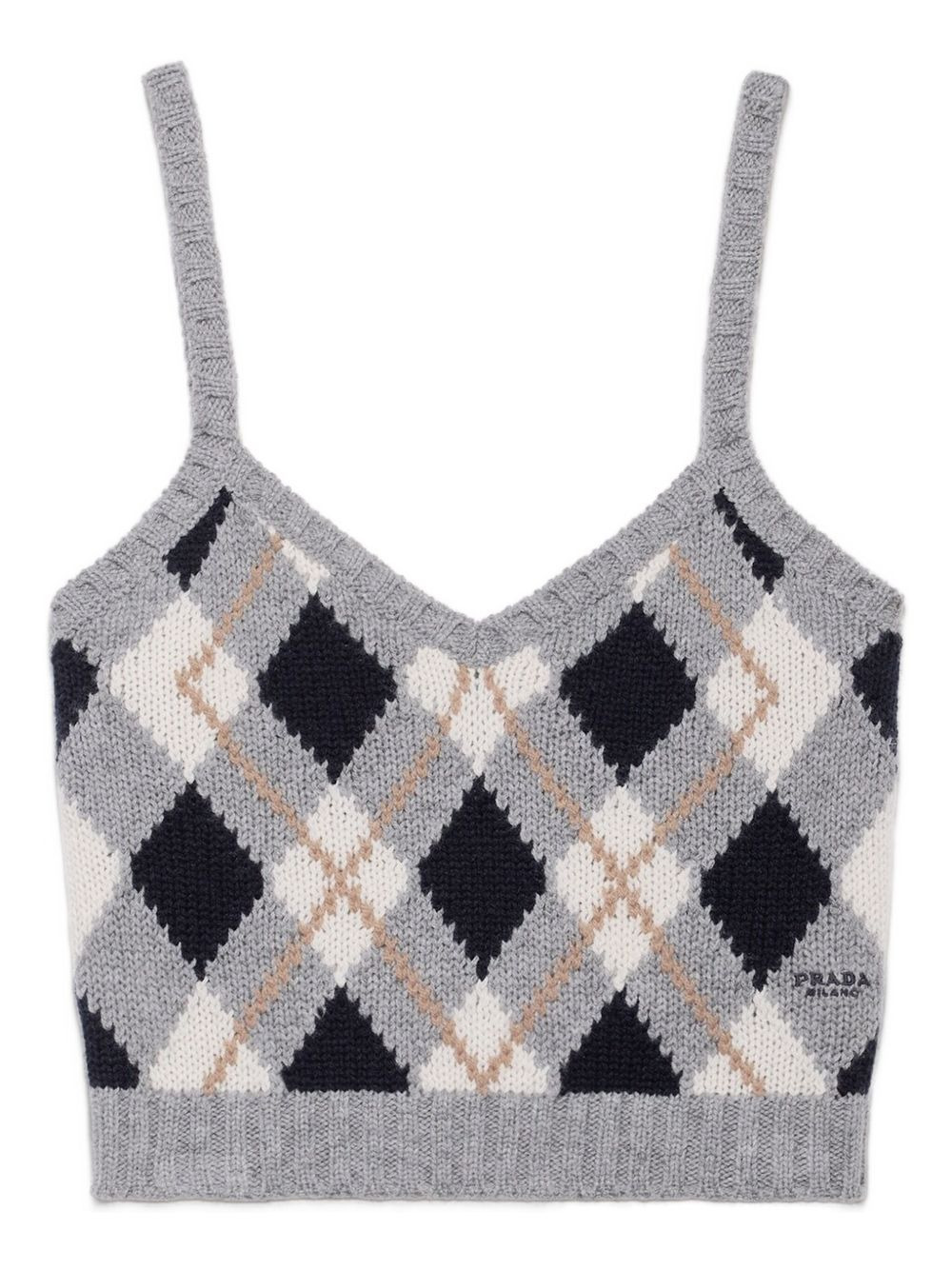 argyle-pattern ribbed top Highlights - Grey - Argyle pattern - Ribbed knit - V-neck - Embroidered logo Composition Wool 100% Washing instructions Dry Clean Only