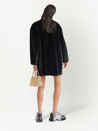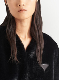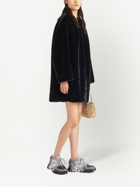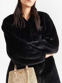 Aspen faux-fur coat black faux-fur design triangle logo patch at the chest crew neck front hook and eye fastening long sleeves straight hem above-knee length Composition Nylon 100% Washing instructions Specialist Cleaning