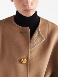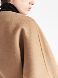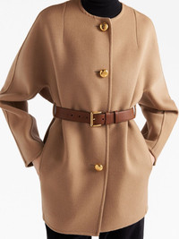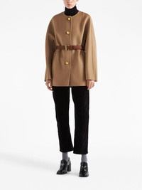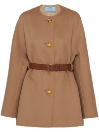 single-breasted wool caban jacket Prada 'reconceptualises, reconsiders and rediscovers ideas of beauty' in its AW23 collection, which is defined by cocooning silhouettes. A case in point, this camel-brown coat is spun from wool and cinched with a matching belt. Logo-detailed gold-tone buttons complete the design. Highlights - Camel brown - Wool - Round neck - Front button fastening - Belted waist - Long sleeves - Two side slit pockets - Straight hem Composition Outer: Wool 100% Washing instructions Read Manufacturer Guidelines