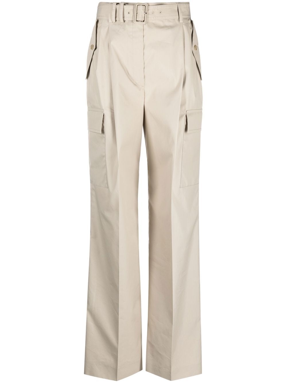 belted wide-leg trousers Designed with a utilitarian aesthetic at its core, these beige-hued trousers from Prada benefit from two oversized patch pockets and a belted waist. Furthermore, to celebrate one of the Italian fashion house's most stylistic codes, the signature enamel triangle motif accents this wide-leg pair. Composition Outer: Cotton 75%, Polyester 25% Lining: Recycled Cupro 100% SIZE & FIT Model measurements Height 5 ft 10 in(1.78 m) Bust/Chest 30.7 in(78 cm) Hips 34.64 in(88 cm) Waist 23.22 in(59 cm) FittingInformation This piece fits true to size. We recommend you get your regular size Designed to be fitted at the waist and hips, loose over the leg Made with a mid-weight non-stretch fabric