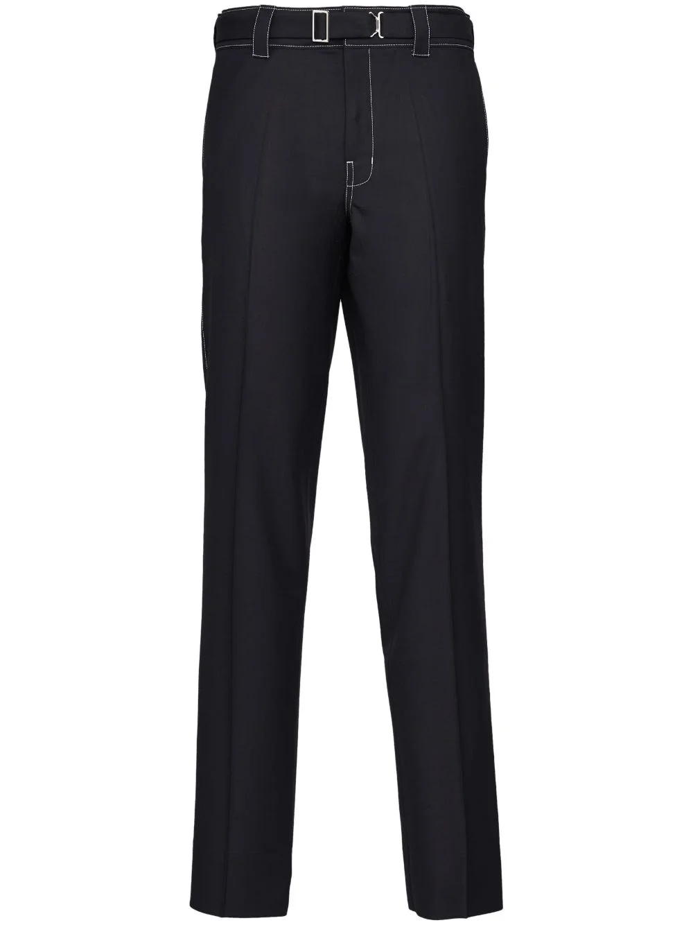 belted wool trousers Highlights - Belted wool straight trousers from prada featuring black, wool, triangle logo, belt loops, concealed fly and button fastening, straight leg, two side slit pockets and two rear welt pockets. Composition Wool 100% Washing instructions Read Manufacturer Guidelines