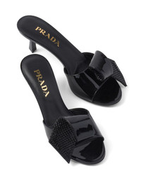 bow-detail patent-leather sandals These sandals are a testament to Prada's unwavering commitment to craftsmanship and design. The patent leather construction is adorned with a charming bow detail for a whimsical finish. Highlights - Black - Leather - Patent finish - Bow detailing - Round open toe - Branded leather insole - Stiletto heel - Slip-on style Composition Outer: Patent Leather 100%, Satin 100% Sole: Leather 100% Lining: Leather 100% SIZE & FIT Measurement HEEL 2.16 in(5.5 cm)