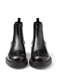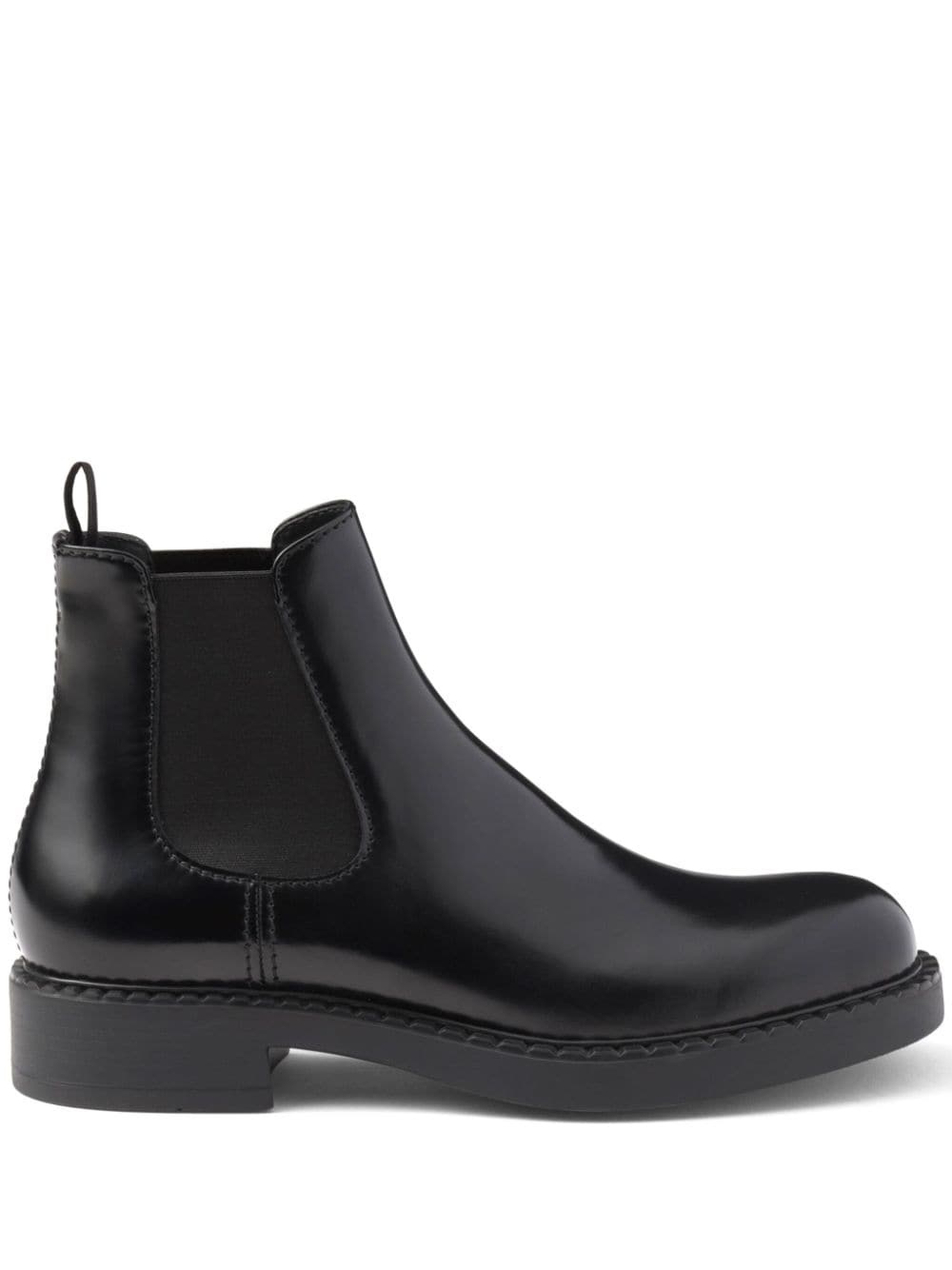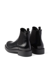brushed-finish Chelsea boots Know for its timeless designs and high-quality materials, the new Chelsea boots from Prada were designed with a brushed finish. Crafted from leather, they feature the classic round toe, a comfortable rubber sole and an easy slip-on style. Highlights - Black - Leather/rubber - Brushed finish - Round toe - Elasticated side panels - Slip-on style - Pull-tab at the heel - Branded insole - Rubber sole - Low heel Composition Lining: Calf Leather 100% Sole: Rubber 100% Outer: Fabric 100%, Calf Leather 100% SIZE & FIT Measurement HEEL 1.57 in(4 cm)