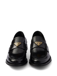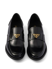 brushed leather loafers Highlights - Black - Calf leather - Brushed effect - Enamel triangle logo - Gold-tone hardware - Moc stitching - Round toe - Rubber sole - Slip-on style Composition Leather 100% SIZE & FIT Measurement HEIGHT 0.78 in(2 cm)