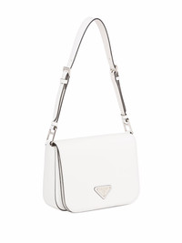 brushed leather shoulder bag Prada's iconic enamel triangle logo is seen throughout its most recent collections, adding a signature touch to each design. Crafted from brushed leather, this sleek white shoulder bag is detailed with two logo-engraved buckle fastenings. Highlights - White - Leather - Brushed finish - Enamel triangle logo - Silver-tone hardware - Front flap closure - Magnetic fastening - Internal slip pocket - Adjustable shoulder strap Composition Outer: Leather 100% SIZE & FIT Measurement STRAP 22.44 in(57 cm) DEPTH 1.96 in(5 cm) HANDLE 5.9 in(15 cm) WIDTH 7.87 in(20 cm) HEIGHT 5.9 in(15 cm)