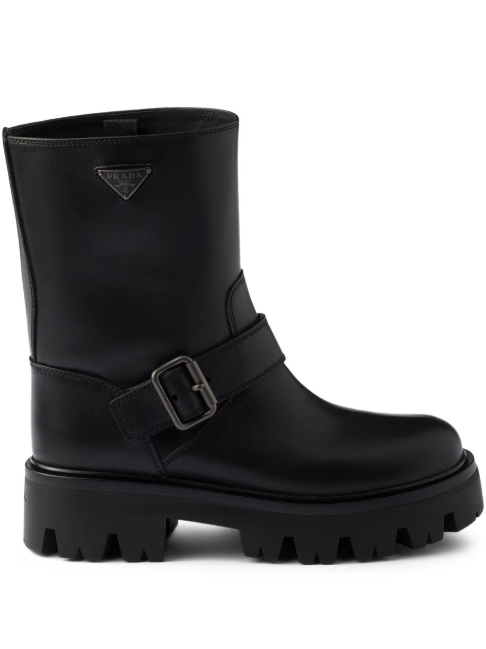 buckle-fastening lug-sole boots Highlights - Black - Leather - Metal buckle fastening - Lug sole - Metal triangle logo Composition Lining: Calf Leather 100% Outer: Calf Leather 100% Sole: Rubber 100%