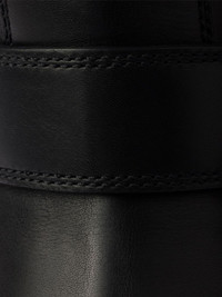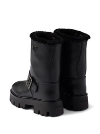 buckle-fastening shearling boots Highlights - Black - Leather upper - Shearling trim - Signature enamel triangle logo - Buckle fastening Composition Sole: Rubber 100% Lining: Sheep Skin/Shearling 100% Outer: Calf Leather 100%