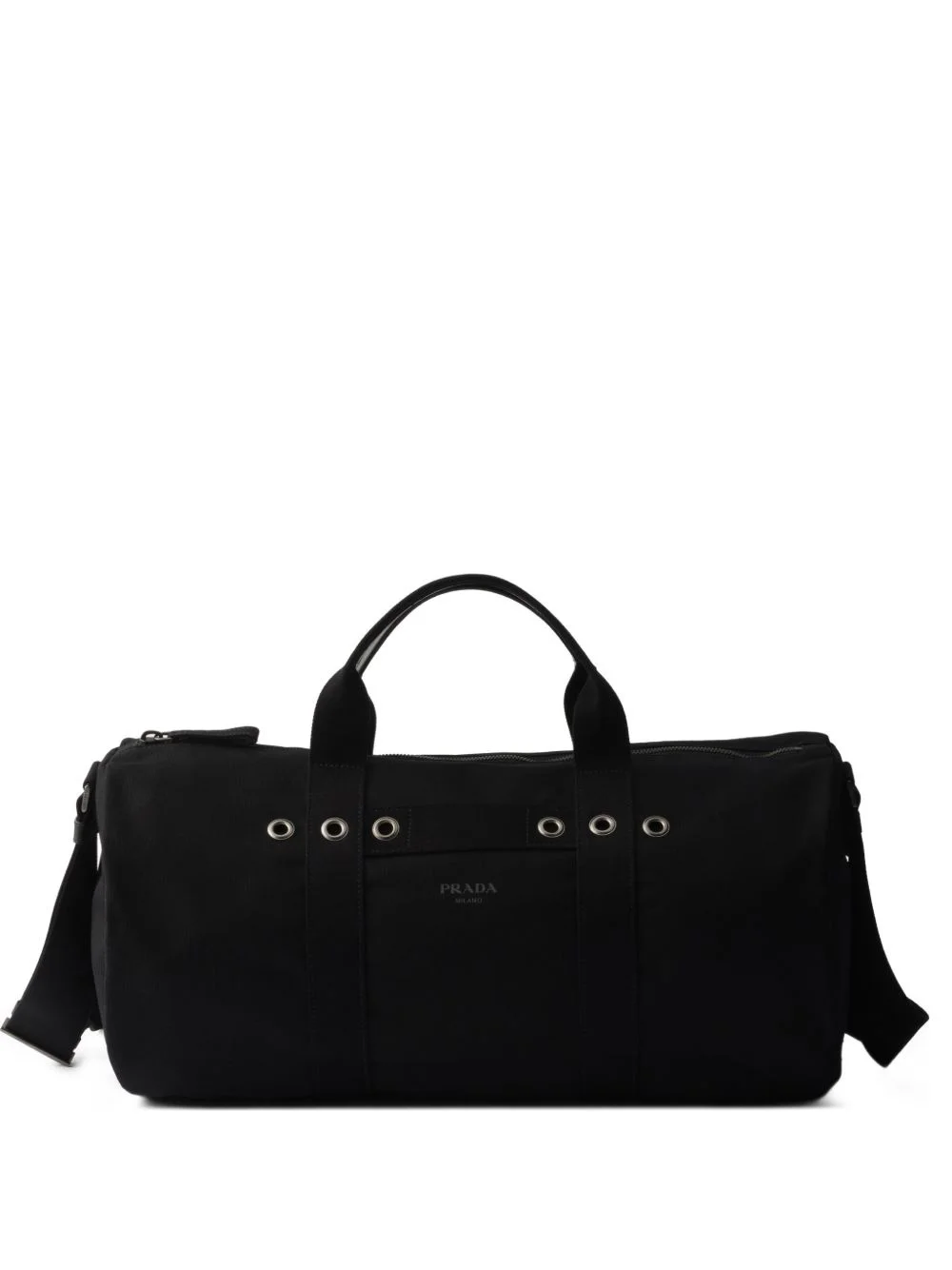 canvas duffel bag Highlights - This duffel bag with clean, graphic lines and bold notes interprets functionality as an authentic expression of style. the soft and compact volume adapts to everyday use, while the cotton canvas gives it a sleek yet sporty look. the design is completed by an adjustable shoulder strap and metal hardware that underline the pragmatic essence of an accessory designed for contemporary dynamism. - Woven cotton tape handles - Adjustable woven cotton tape shoulder strap. maximum length: 140 cm - minimum length: 77 cm - maximum drop: 70 cm - minimum drop: 35 cm - Printed logo on front and enameled metal triangle logo on the side - Zipper closure - Interior with zipper pocket - Canvas lining Composition Outer: Cotton 100% SIZE & FIT Measurement DEPTH 10.62 in(27 cm) HEIGHT 10.62 in(27 cm) WIDTH 20.86 in(53 cm)