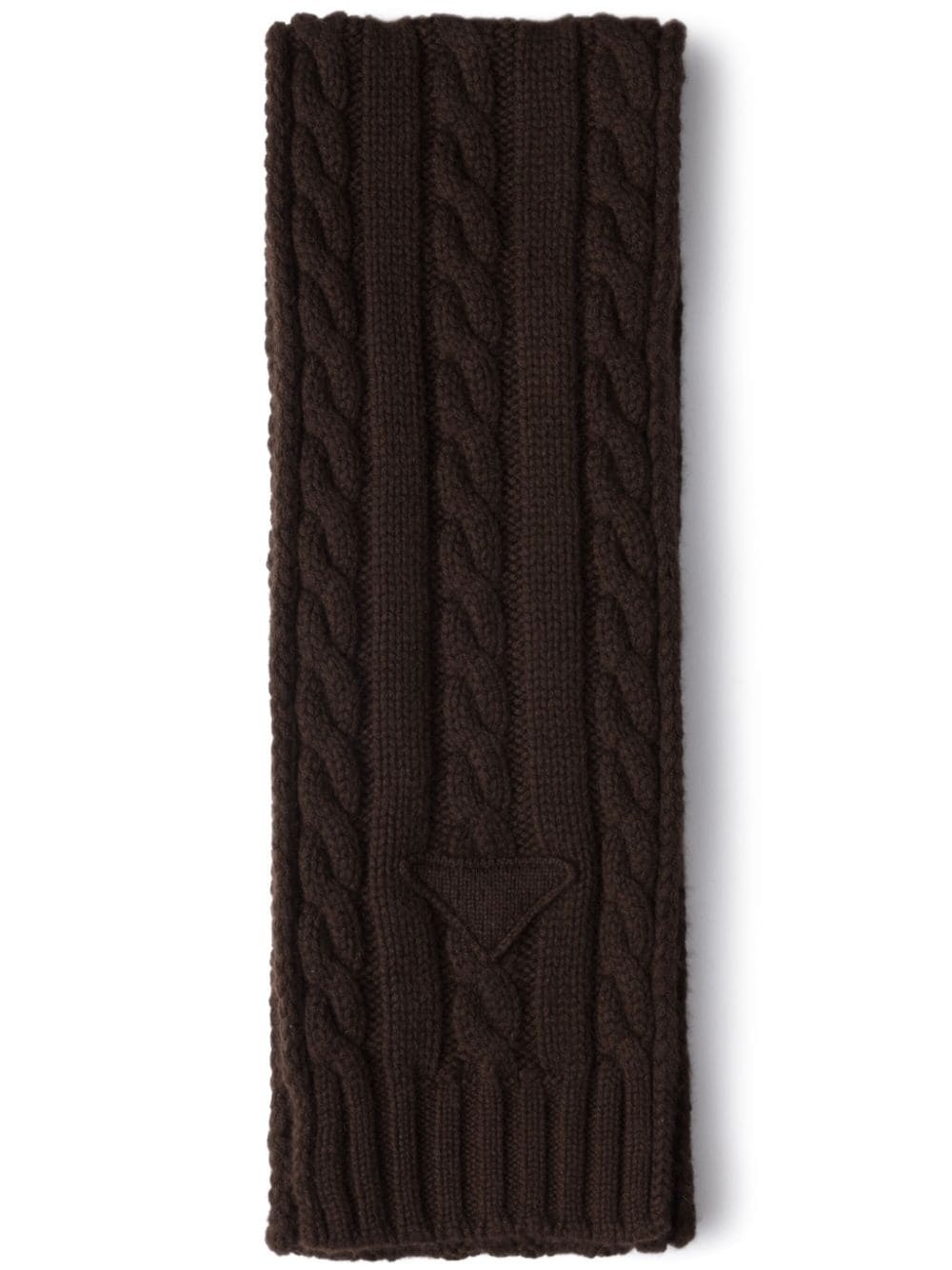 cashmere cable-knit scarf Highlights - Brown - Cashmere - Chunky cable knit - Triangle logo - Ribbed edge Composition Cashmere 100% SIZE & FIT Measurement LENGTH 62.99 in(160 cm)