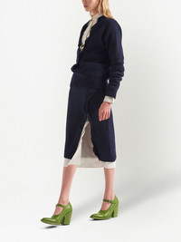 side-split wool-cashmere skirt Cut to a classic mid-length, this knitted cashmere skirt is imagined by Prada in a versatile navy hue for SS23. The sleek side slit is toned down by the playful scallop edge detailing. Highlights - Navy blue - Cashmere - Knitted construction - Side button fastening - High waist - Side slit - Scallop edge - Mid-length Composition Cashmere 100%