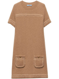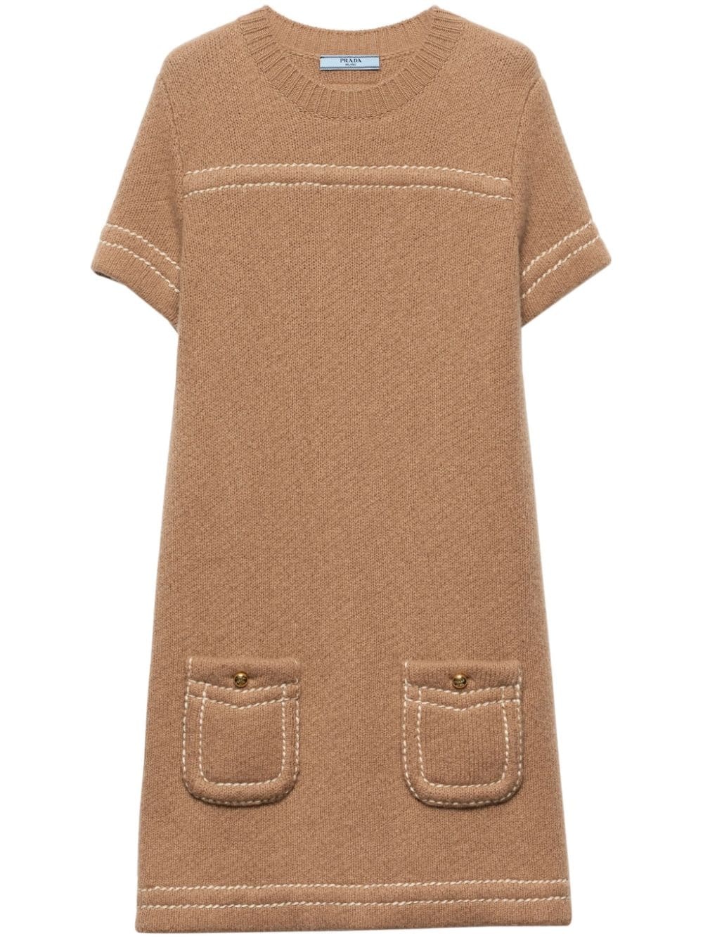 cashmere mini dress Highlights - Camel brown - Cashmere - Decorative stitching - Triangle logo - Crew neck - Short sleeves - Two front patch pockets - Straight hem Composition Cashmere 100%
