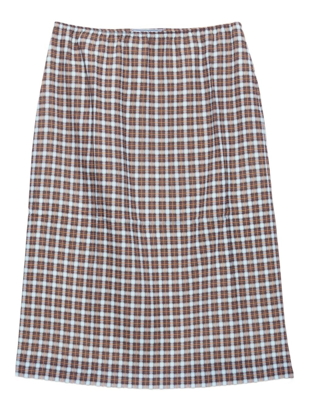 check-print sheath skirt Highlights - Light blue - Check print - Side zip fastening - Hook closure - Triangle logo Composition Virgin Wool 100% Washing instructions Read Manufacturer Guidelines