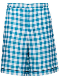 check-print silk bermuda shorts Highlights - Turquoise blue/white - Silk - Check print - Logo print to the rear - Elasticated waistband - Front button and zip fastening - Knee-length - Two side slit pockets - Rear patch pocket Composition Silk 100% Washing instructions Read Manufacturer Guidelines