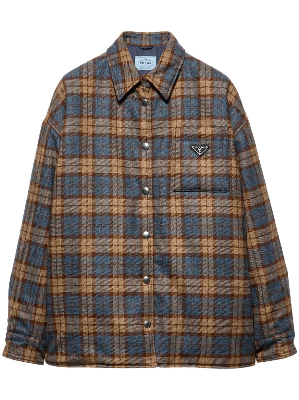checked wool-twill lumberjack jacket Highlights - Tobacco brown - Wool - Check pattern - Enamel triangle logo - Classic collar - Front button fastening - Long sleeves - Chest patch pocket - Straight hem Composition Wool 100%