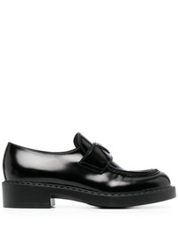 Chocolate logo plaque 40mm loafers Sitting atop a chunky rubber sole, this black iteration of the Chocolate loafers has become one of Prada's most coveted silhouettes. Made in Italy from calf leather and elevated with a patent finish throughout, the pair is adorned with a signature triangle logo plaque at the front. Highlights - Black - Brushed finish - Slip-on style - Round toe - Enamel triangle logo - Piped-trim detailing - Mid block heel Composition Leather 100% SIZE & FIT Measurement HEEL 1.57 in(4 cm) Sole height 0.59 in(1.5 cm)