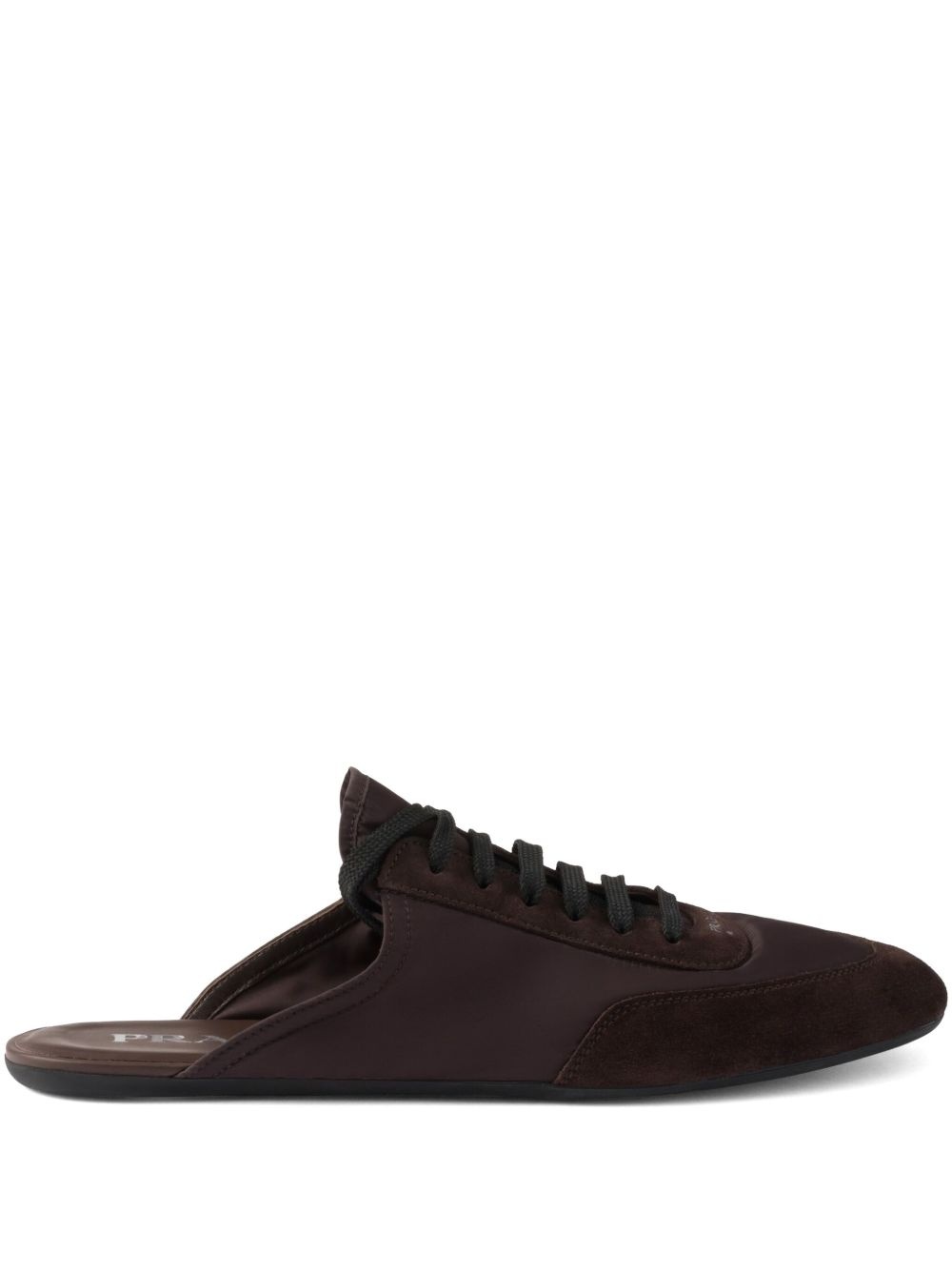 Collapse mules Highlights - Coffee brown - Slip-on style - Front lace-up fastening - Branded footbed - Panelled design Composition Outer: Recycled Nylon 100%, Calf Suede 100% Lining: Calf Leather 100% Sole: Rubber 100%