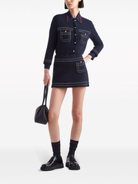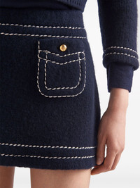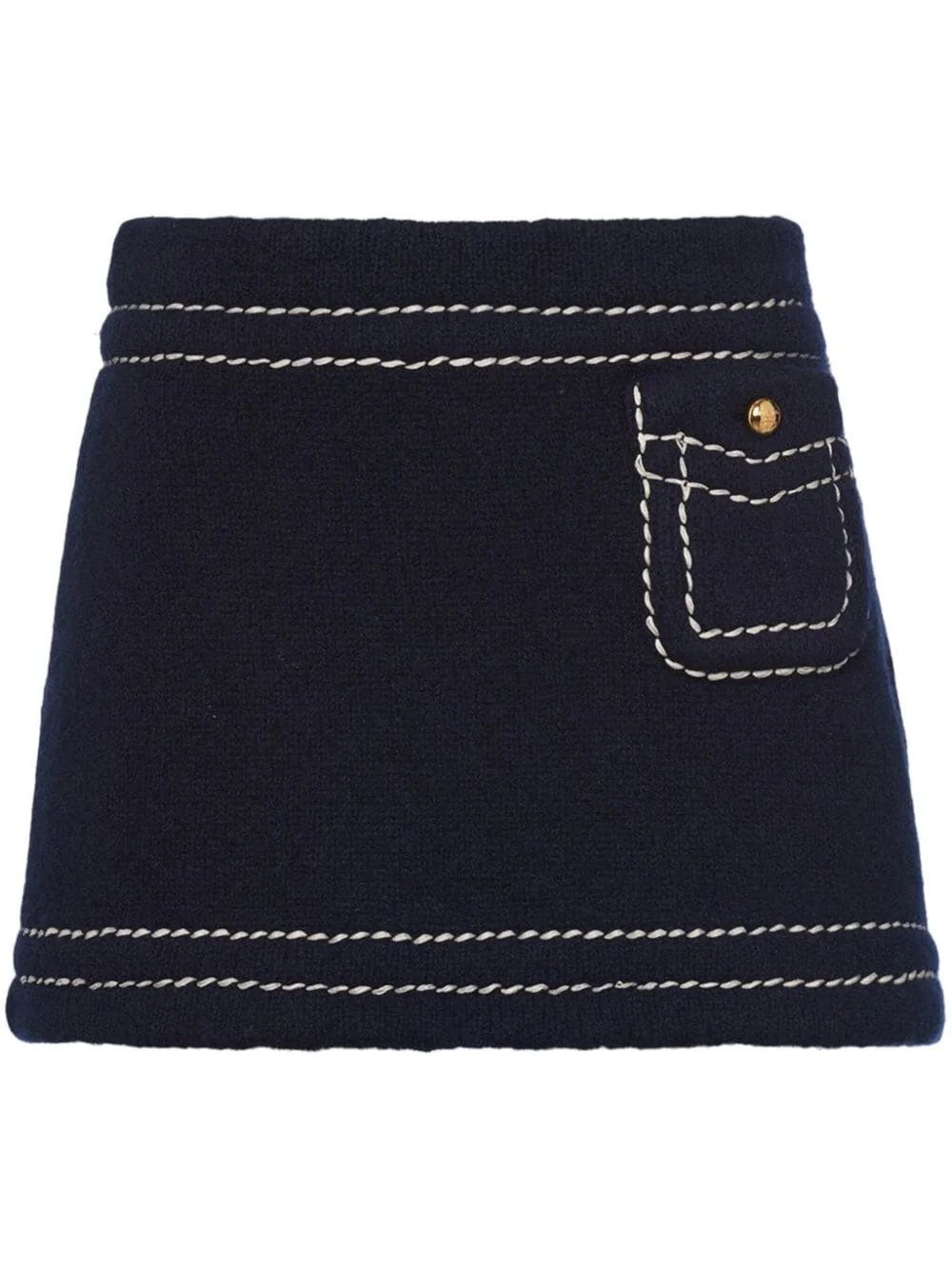 contrast-stitching cashmere miniskirt Offering its "interpretation of the contemporary", Prada's miniskirt is crafted from navy blue cashmere and is traced with oversized stitching in contrasting white threads. Highlights - Navy blue/white - Cashmere - Contrast stitching - Concealed side zip fastening - Front patch pocket - Thigh-length Composition Cashmere 100% Washing instructions Read Manufacturer Guidelines