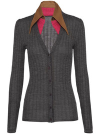 collar-detail cashmere-silk cardigan Woven from plush cashmere into a finely ribbed knit, this V-neck cardigan is elevated with a twon-tone contrasting silk pointed collar — a nod to Prada's exploration of colour and silhouettes. Highlights - Dark grey/camel brown/fuchsia pink - Cashmere/silk - Knitted construction - Fine ribbed - Oversized pointed collar - V-neck - Front button fastening Composition Cashmere 100%, Silk 100% Washing instructions Read Manufacturer Guidelines