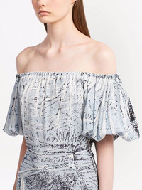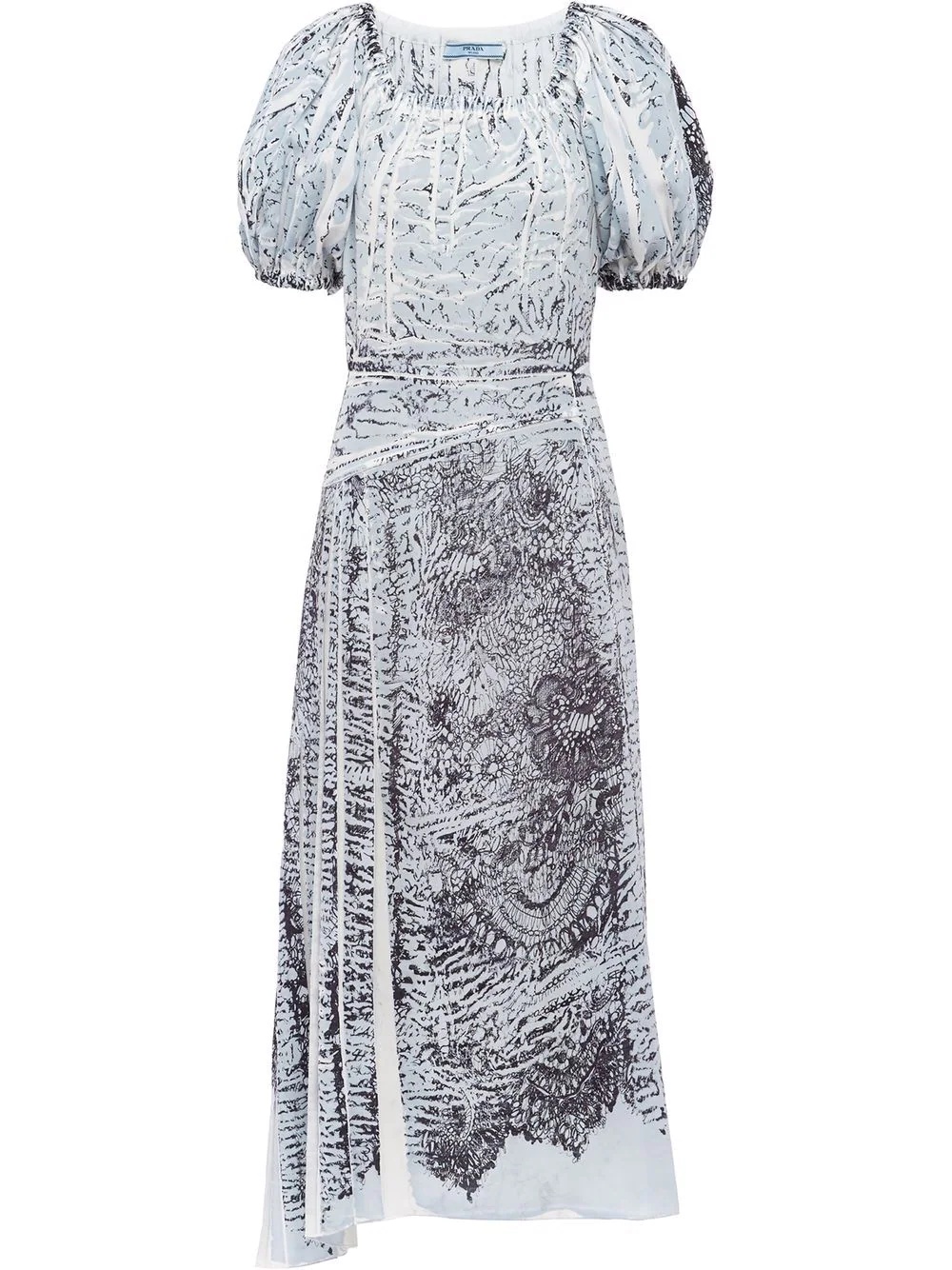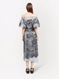 coral-print silk midi dress Prada's SS22 collection is, in part, a collaboration with the MedSea Foundation to support them in their 'project to restore marine ecosystems'. Representative of that is this silk midi dress from the line-up; decorated with an abstarct coral pattern. Highlights - Black/grey - Silk - Abstract pattern print - Off-shoulder - Short sleeves - Elasticated trim - Mid-length Composition Silk 100%