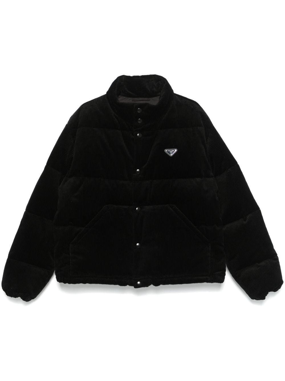 corduroy jacket Highlights - Black - Cotton - Corduroy - Down-feather filling - Padded design - Front press-stud and zip fastening - Funnel neck - Long sleeves - Elasticated cuffs - Enamel triangle logo - Two side pouch pockets - Full lining - Straight hem Composition Lining: Recycled Polyamide 100%, Polyester 100%, Goose Down 90%, Goose Feather 10% Outer: Cotton 100% SIZE & FIT Model measurements Height 6 ft 2 in(1.87 m) Bust/Chest 37.79 in(96 cm) Hips 37.79 in(96 cm) Waist 30.31 in(77 cm) FittingInformation Designed to be unstructured, offering a loose fit throughout The internal drawstring at the hem allows for fitted preferences Made from a padded non-stretch fabric, giving it no natural elasticity Washing instructions Hand Wash