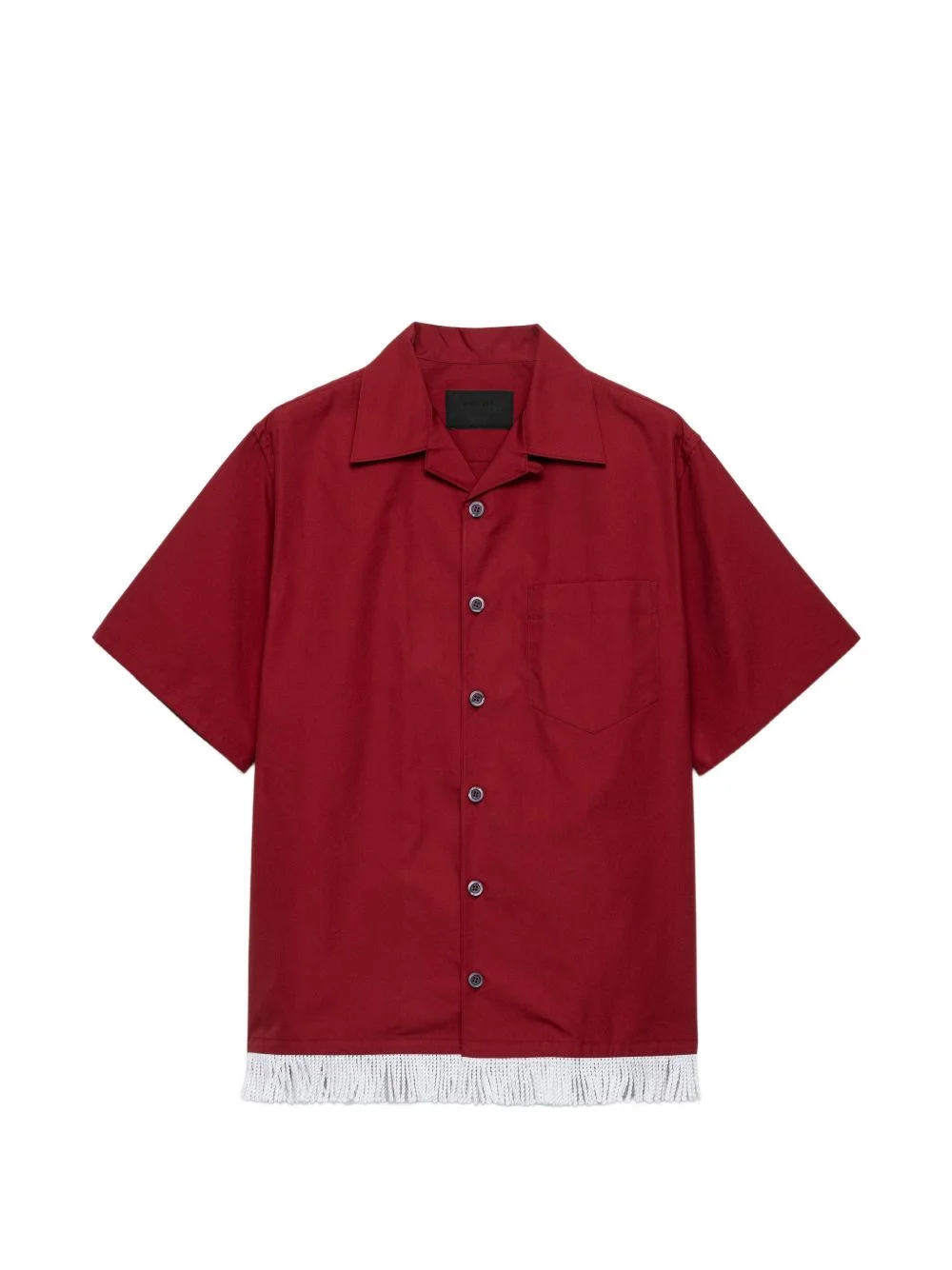 Cotton blend fringed bowling shirt Straight fit Bowling collar Classic breast pocket Straight hem Mother-of-pearl button closure Fabric triangle logo on the back Decorative fringe on the hem Nylon A change of tone redefines classics from the Prada wardrobe like the bowling shirt presented with original, retro-inspired details. The lighthearted freedom of the season is translated into a lightweight, boxy silhouette with fringe on the hem. Composition Polyester 65%, Cotton 35%