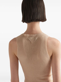 cotton ribbed tank top This cotton tank top showcases a delicate ribbed design elevated by a slightly squared scoop neck. On the back, Prada's triangle logo appears as a tonal applique. Highlights - Light beige - Cotton - Fine ribbed - Triangle logo - Scoop neck - Sleeveless - Straight hem Composition Cotton 100%