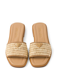 crochet-detail leather sandals Highlights - Beige - Square open toe - Flat leather sole - Enamel triangle logo Composition Outer: Raffia 100%, Calf Leather 100% Lining: Leather 100% Sole: Leather 100%