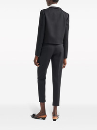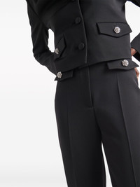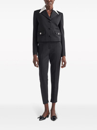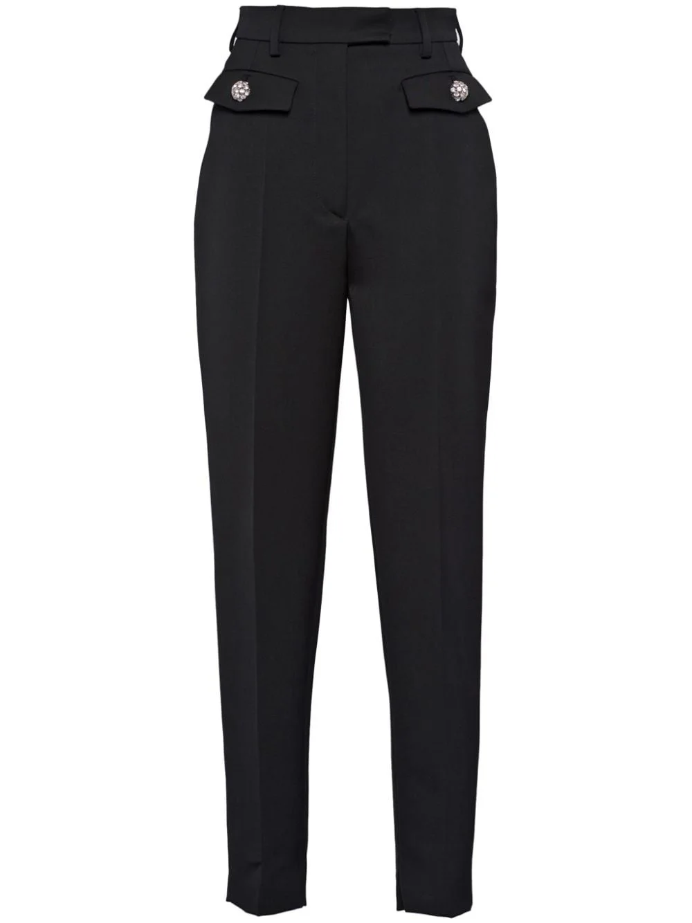 wool sateen trousers Prada injects these cropped trousers with a retro allure. Crafted from wool, they're highlighted by jewelled buttons on the pockets for an elegant touch. Highlights - Black - Wool - High waist - Belt loops - Concealed front fastening - Two front flap pockets - Pressed crease - Slim cut - Side slits - Cropped Composition Wool 100% Washing instructions Read Manufacturer Guidelines