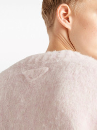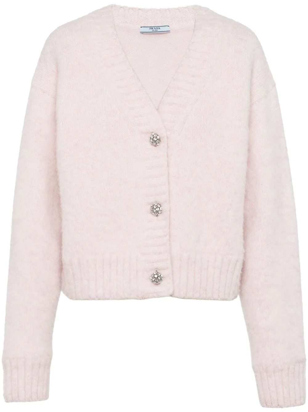 wool V-neck cardigan Woven from plush shetland wool in Italy, this alabaster pink cardigan from Prada is cut to a relaxed V-neck silhouette. It is punctuated with crystal-embellished buttons for an ornate look whilst the house's signature triangle motif adorns the rear. Highlights - Alabaster pink - Wool - Knitted construction - V-neck - Drop shoulder - Long sleeves - Crystal-embellished buttons - Logo patch to the rear - Ribbed cuffs and hem Composition Wool 100% Washing instructions Read Manufacturer Guidelines