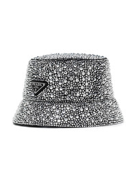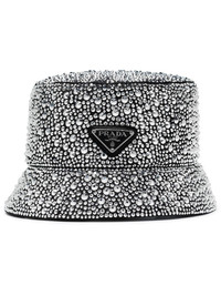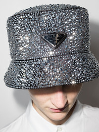 crystal-embellished bucket hat For SS22 Prada explores classic styles with contemporary detailing, demonstrating the brand's ever-evolving, opulent designs. An example, this bucket hat. Adorned with all-over intricately embellished crystals, the distinctive leather logo patch stamps the dazzling garment with brand authenticity. Composition Outer: Calf Leather 100%, Viscose 72%, Silk 28% Lining: Cotton 100% SIZE & FIT Model measurements Height 5 ft 10 in(1.78 m) Bust/Chest 31.49 in(80 cm) Hips 34.25 in(87 cm) Waist 23.62 in(60 cm) Measurement BRIM 1.96 in(5 cm) CIRCUMFERENCE 21.25 in(54 cm)