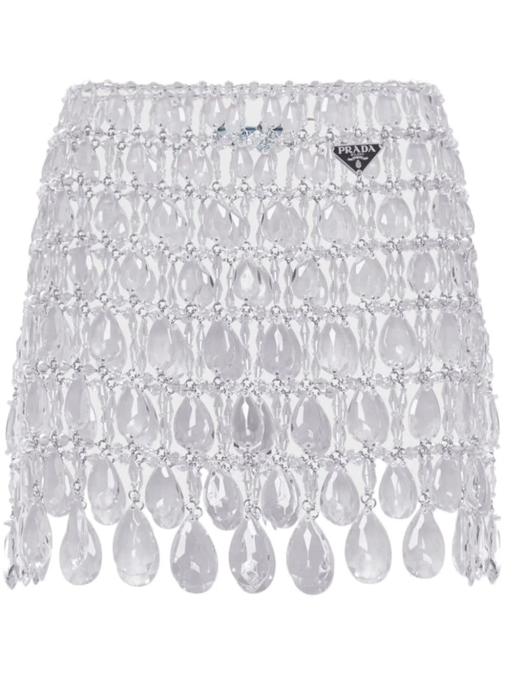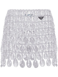 crystal-embellished fringed miniskirt In the words of Raf Simons, this Prada mini skirt is ‘built like jewellery.’ It’s intricately linked from faceted crystals in a medley of shapes and sizes and dotted with a signature enamelled triangle logo at the hip. Highlights - White - Crystal embellishment - Enamel triangle logo - Side hook and eye fastening - Thigh-length - Full lining Composition Acetate 100%