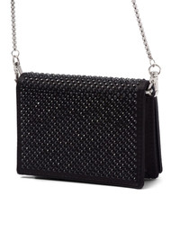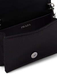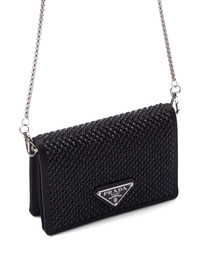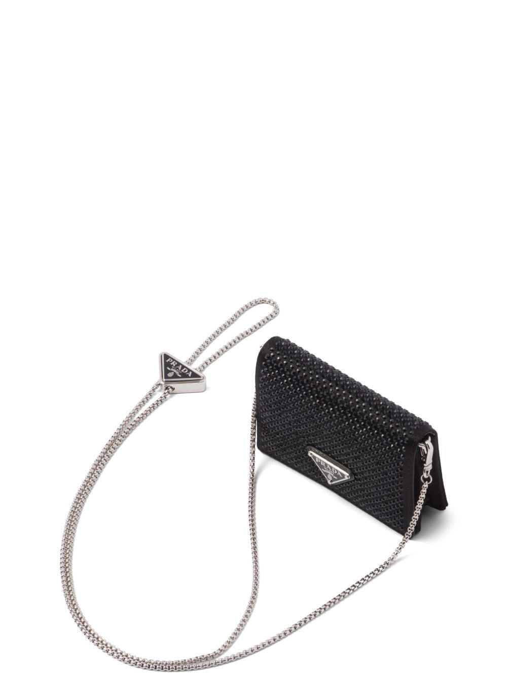 crystal-embellished satin cardholder Highlights - Black - Satin weave - Crystal embellishment - Enamel triangle logo - Silver-tone hardware - Foldover top with magnetic fastening - Detachable chain-link shoulder strap - Main compartment - Internal slip pocket - Internal logo stamp - Leather lining Composition Outer: Satin 100%, Crystal 100%, Leather 100% SIZE & FIT Measurement HEIGHT 3.14 in(8 cm) WIDTH 4.52 in(11.5 cm)