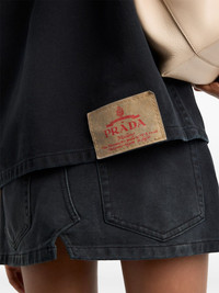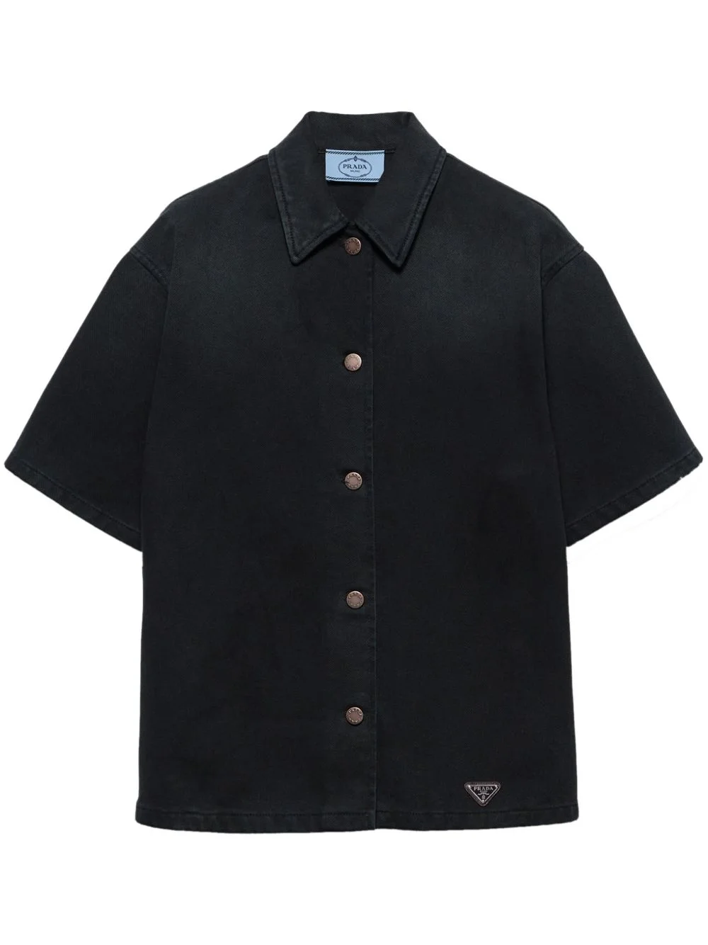 Denim shirt Garment dyed and washed treatment Loose fit Unlined garment Shirt collar Front button closure Short sleeves Matching stitching Triangle logo Center-back length: 65 cm, Size: 38 Prada Milano logo label on the backCotton Composition Cotton 100% Washing instructions Read Manufacturer Guidelines