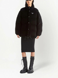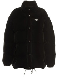 convertible velvet down jacket Highlights - Black - Velvet - Padded design - Silver-tone hardware - Detachable sleeves - Enamel triangle logo - High neck - Front press-stud fastening - Drop shoulder - Long sleeves - Elasticated cuffs - Drawstring hem - Two front welt pockets Composition Velvet 100%