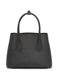 Double Saffiano leather tote bag The Double Saffiano bag is one of Prada's classics from the SS23 collection. Crafted from leather and featuring the signature triangle logo, the tote comes with a detachable strap, making it suitable for all occasions. Highlights - Black - Leather - Gold-tone hardware - Logo patch to the front - Adjustable detachable shoulder strap - Two top handles - Luggage tag - Partitioned compartment - Internal slip pocket Composition Outer: Leather 100% SIZE & FIT Measurement DEPTH 4.92 in(12.5 cm) HEIGHT 7.28 in(18.5 cm) WIDTH 9.84 in(25 cm)