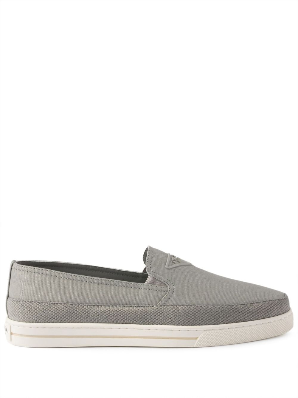 embossed-logo slip-on Highlights - Grey - Embossed triangle logo - Lightweight rubber sole - Logo heel - Removable leather-covered insole - Cloth canvas upper Composition Outer: Polyester 100%, Polyurethane 100%, Polyamide 100% Lining: Calf Leather 100% Sole: Rubber 100%