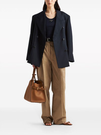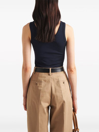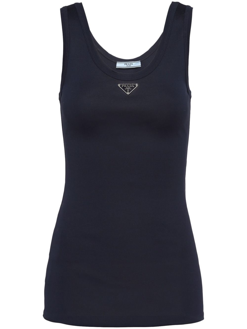 enamel-triangle cotton top Prada's tank top showcases the brand's minimalist aesthetic. Notice the black cotton construction and signature enamel triangle logo plaque embellishment. Highlights - Navy blue - Cotton - Jersey texture - Enamel triangle logo to the front - Round neck - Sleeveless - Straight hem Composition Cotton 100% SIZE & FIT FittingInformation Designed for a close fit throughout Made from a midweight non-stretch fabric, this piece offers minimal elasticity when worn