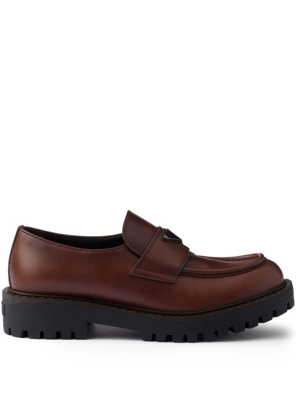 enamel-triangle logo loafers Highlights - Brown - Leather upper - Lug tread sole - Rubber sole - Leather welt - Metal triangle logo Composition Outer: Calf Leather 100% Lining: Calf Leather 100% Sole: Rubber 100%
