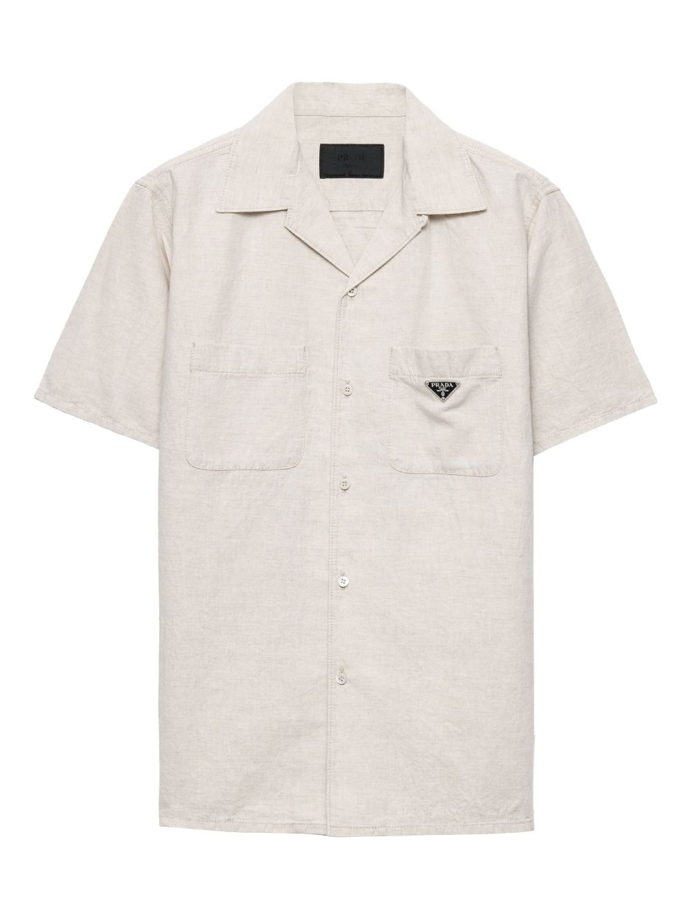 enamel triangle-logo shirt Highlights - Light beige - Front button fastening - Chest patch pocket - Notched lapels - Short sleeves Composition Cotton 65%, Linen/Flax 35% Washing instructions Read Manufacturer Guidelines