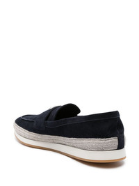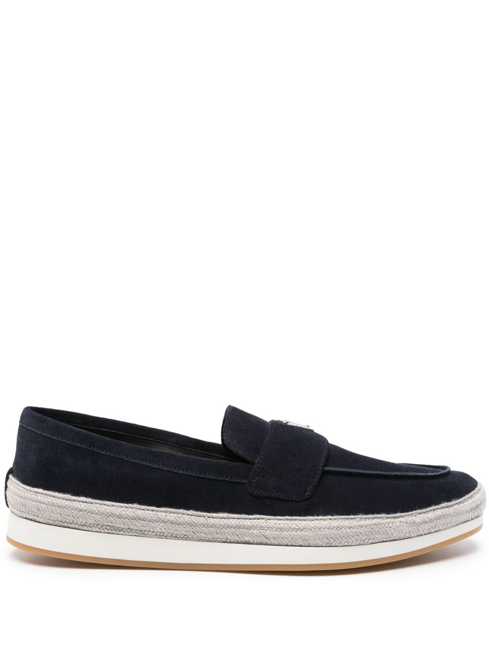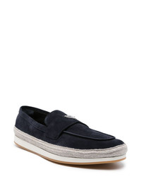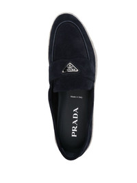 enamel triangle-logo suede loafers Prada's iconic triangle logo sits proudly at the centre of these blue loafers, adding an emblematic touch to their classic shape. They're crafted from smooth suede and sit atop a light expanded rubber sole and tread. Highlights - Navy blue - Calf leather - Suede - Almond toe - Enamel triangle logo to the front - Branded leather insole - Braided edge - Flat rubber sole - Slip-on style Composition Lining: Calf Leather 100% Outer: Calf Suede 100% Sole: Rubber 100% SIZE & FIT Measurement HEEL 0.78 in(2 cm) Sole height 0.47 in(1.2 cm)