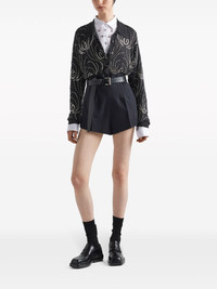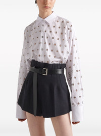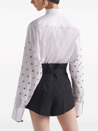 eyelet-embellished cotton shirt Metallic accents bring a contemporary touch to this white Prada shirt. Cut from crisp cotton poplin to a relaxed silhouette, it's embellished with eyelets throughout, lending a see-through element in a 'dual game of solids and voids'. Highlights - White - Cotton - Poplin texture - Eyelet embellishment - Spread collar - Drop shoulder - Front button placket - Long sleeves - Buttoned cuffs - Straight hem Composition Cotton 100%