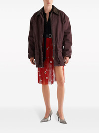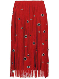 eyelet-embellished fringe skirt Prada showcases a bold design with this red skirt, defined by the flowing fringe construction. Scattered eyelets provide an edgy finishing touch. Highlights - Red - Eyelet embellishment - Fringe detailing - High-waisted - Knee-length Composition Viscose 100%