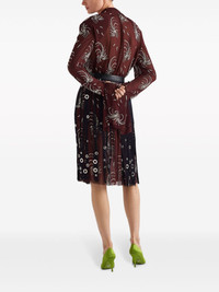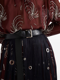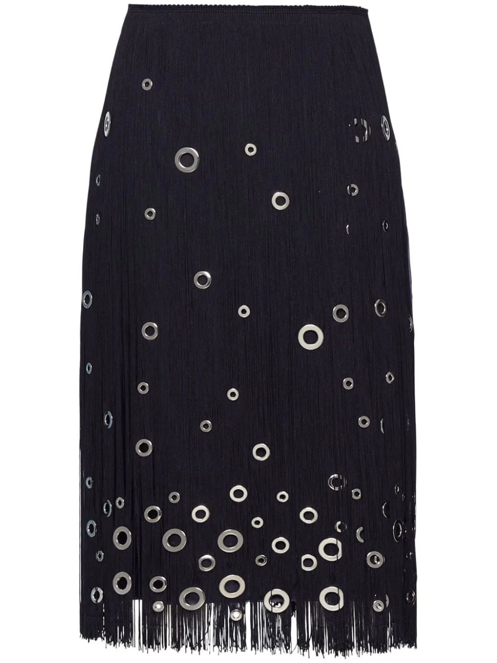 eyelet-embellished fringe skirt Prada showcases a bold design with this midnight blue skirt, defined by the flowing fringe construction. Scattered eyelets provide an edgy finishing touch. Highlights - Midnight blue - Eyelet embellishment - Fringe detailing - High-waisted - Knee-length Composition Viscose 100% Washing instructions Read Manufacturer Guidelines