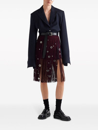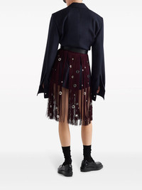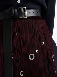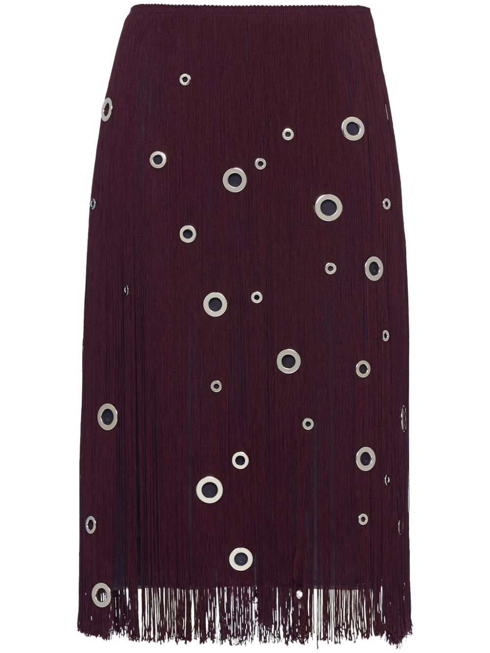 eyelet-embellished fringed midi skirt Likened by Raf Simons to being ‘built like jewellery’, this Prada skirt is a devotion to craft and technique. The fully fringed silhouette is embellished with a smattering of silver-tone eyelets 'in a dualistic interplay of solids and voids'. Highlights - Burgundy - Fringed design - Eyelet embellishment - Side hook and eye fastening - High-waisted - Knee-length - Full lining Composition Viscose 100% Washing instructions Read Manufacturer Guidelines